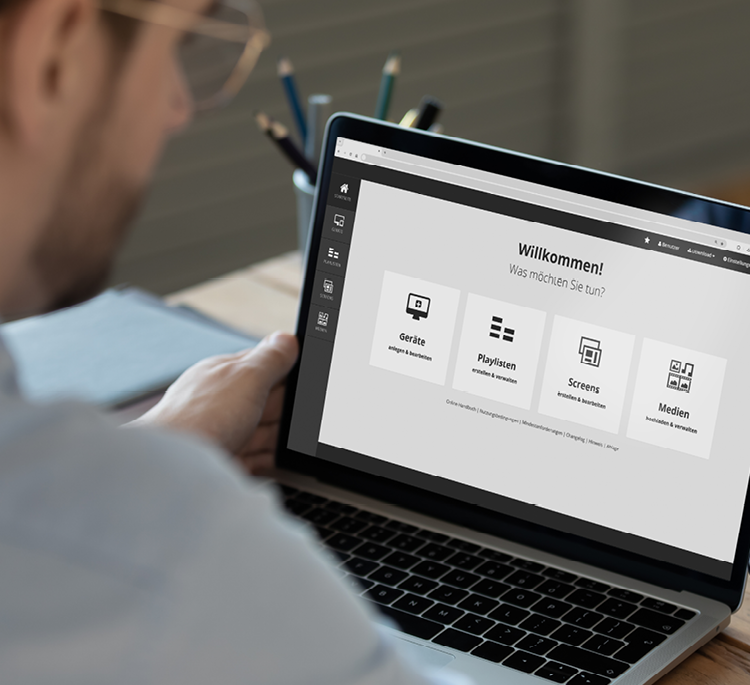 Kreieren Sie mit dem Screen-Designer einfach und schnell Ihr individuelles Template oder erstellen Sie Playlisten aus bereits bestehenden Inhalten. Touch-Ereignisse, QR-Codes und weitere Features werten dabei Ihre Inhalte zusätzlich auf. Der integrierte XML-Editor und die Anbindung externer Datenbanken vereinfachen Ihnen die Content-Pflege. Die integrierte Rollen- und Rechteverwaltung unterstützt Sie bei der Zuteilung von Aufgaben. Im Anschluss verteilt die smarte CMS-Cloud die Inhalte zuverlässig und schnell auf Ihre Bildschirme, Multiscreens und Tablets.